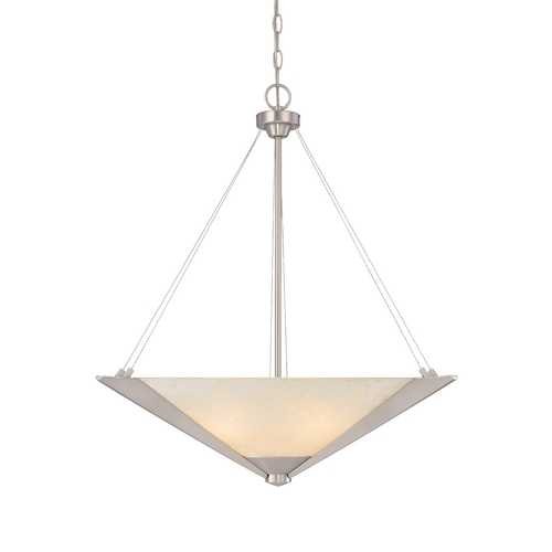 Satin nickel finish with glacier glass. Bold lines and thin cables combine in this four-light pendant. Six thin cables support a radiant glacier glass bowl, while an angled frame holds the bowl in place. Includes six feet of chain. Takes four 100-watt medium base bulbs (not included). Dolan Designs offers an unparalleled selection of lighting fixtures, from classic designs to the latest styles and finishes. Without sacrificing affordability, each piece is a statement of style and beauty. Can't find what you're looking for? Give us a call at 1-800-653-6556 or send us an email at customerservice@destinationlighting.com and we'll help you find the product. With our 14 physical stores and close relationship with our manufacturers, we are able to provide accurate answers faster than other online retailers. DL # 285493..../ Four-Light Pendant / Dolan Lights